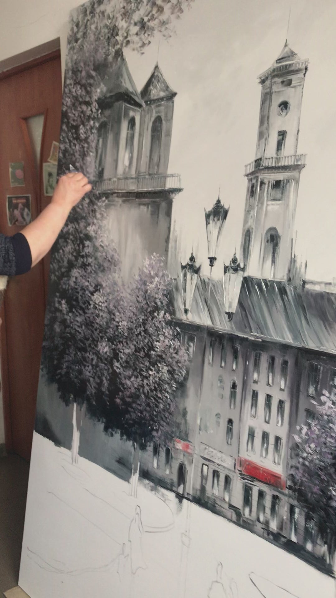 Couple in Paris Painting on Canvas Black and White City Wall Art Paris Artwork Large Oil Painting Cityscape Art