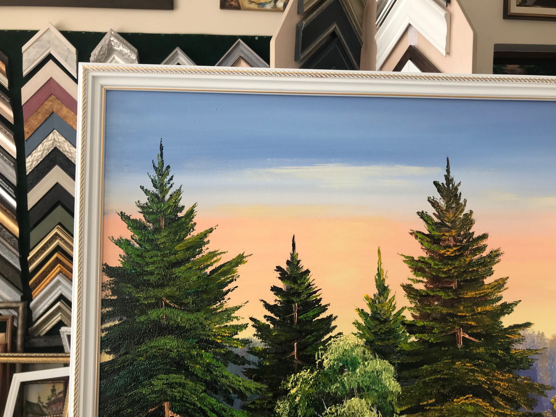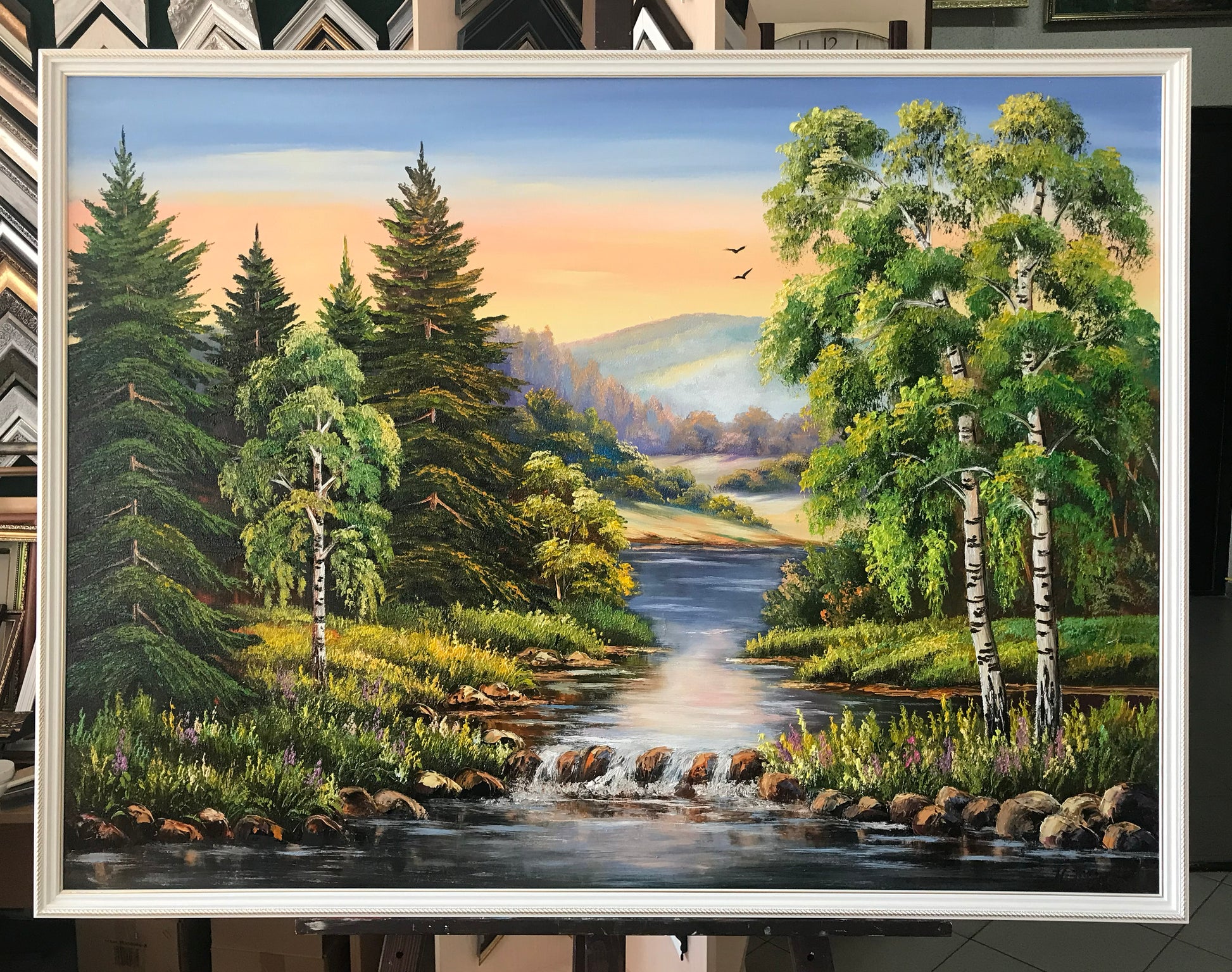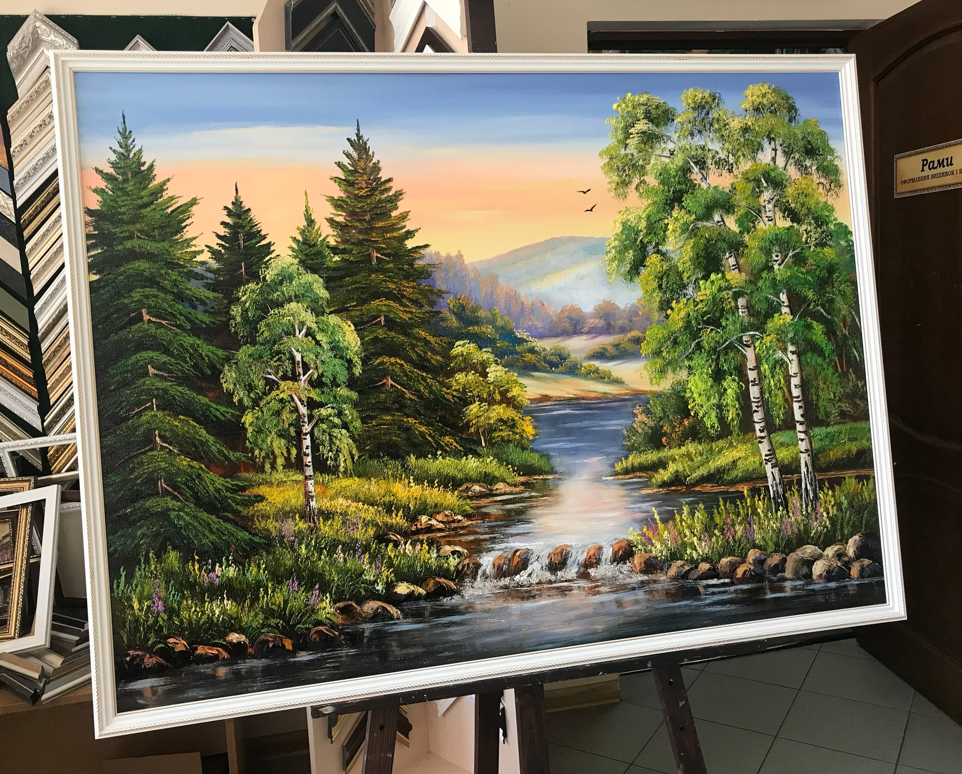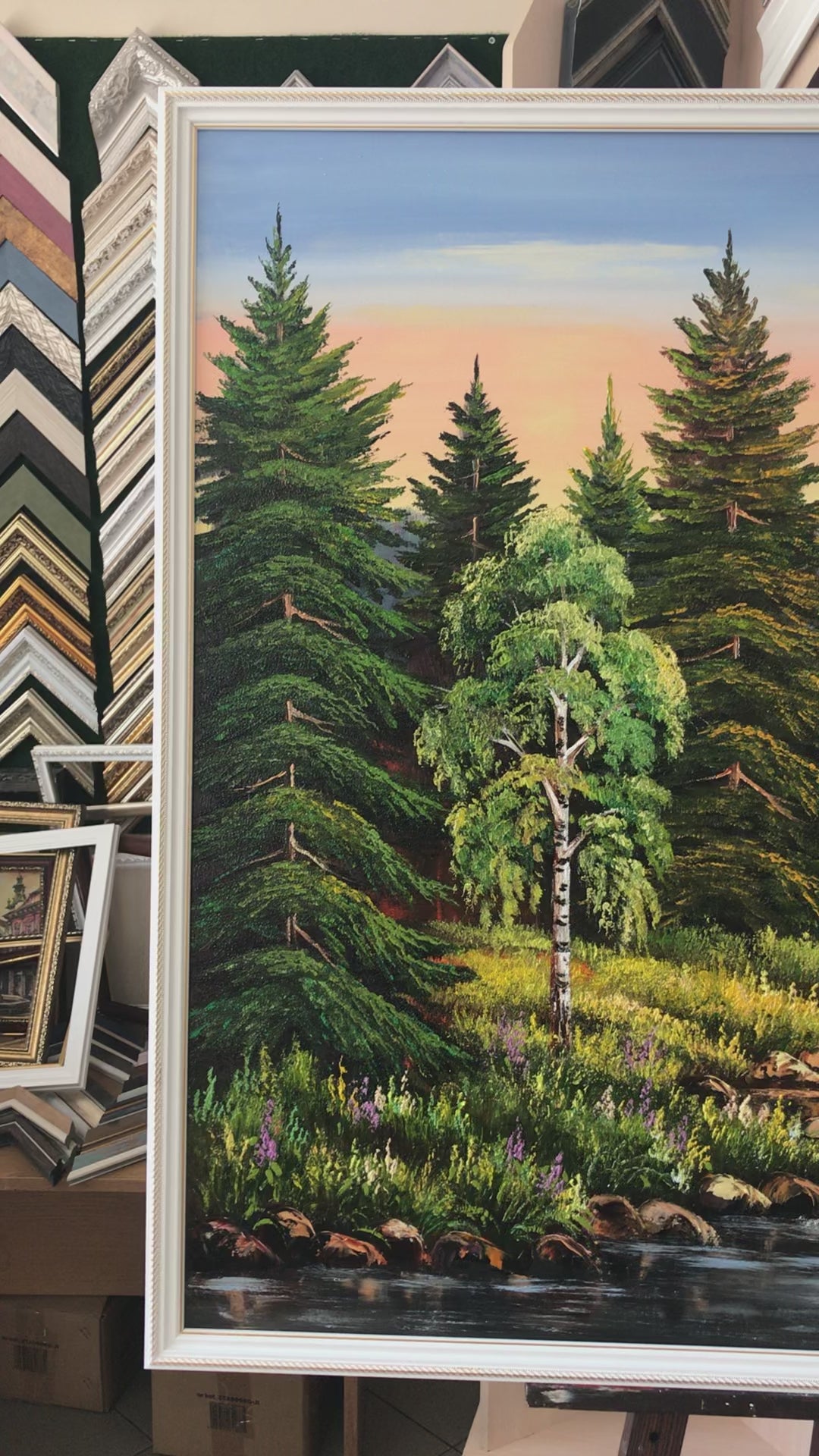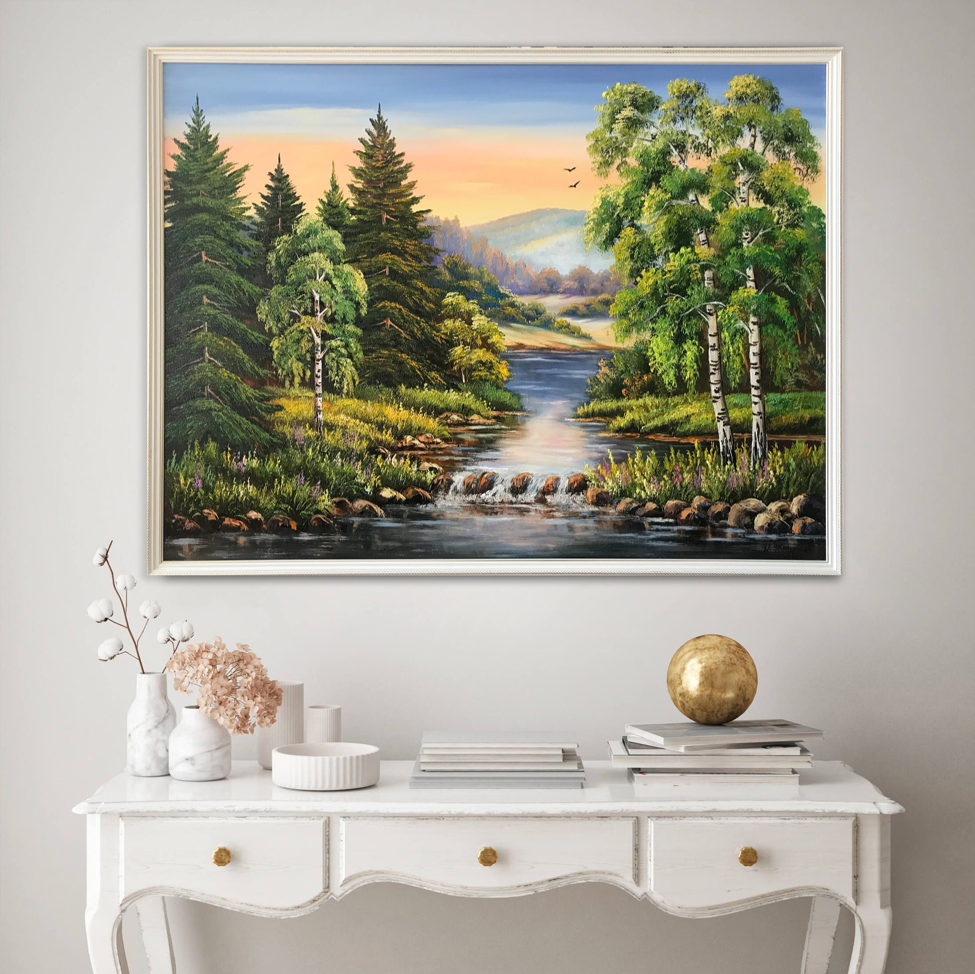 Green Forest Painting Original Trees Wall Art River Oil Painting on Canvas Pine Tree Artwork Nature Art for Bedroom Landscape Painting Oil