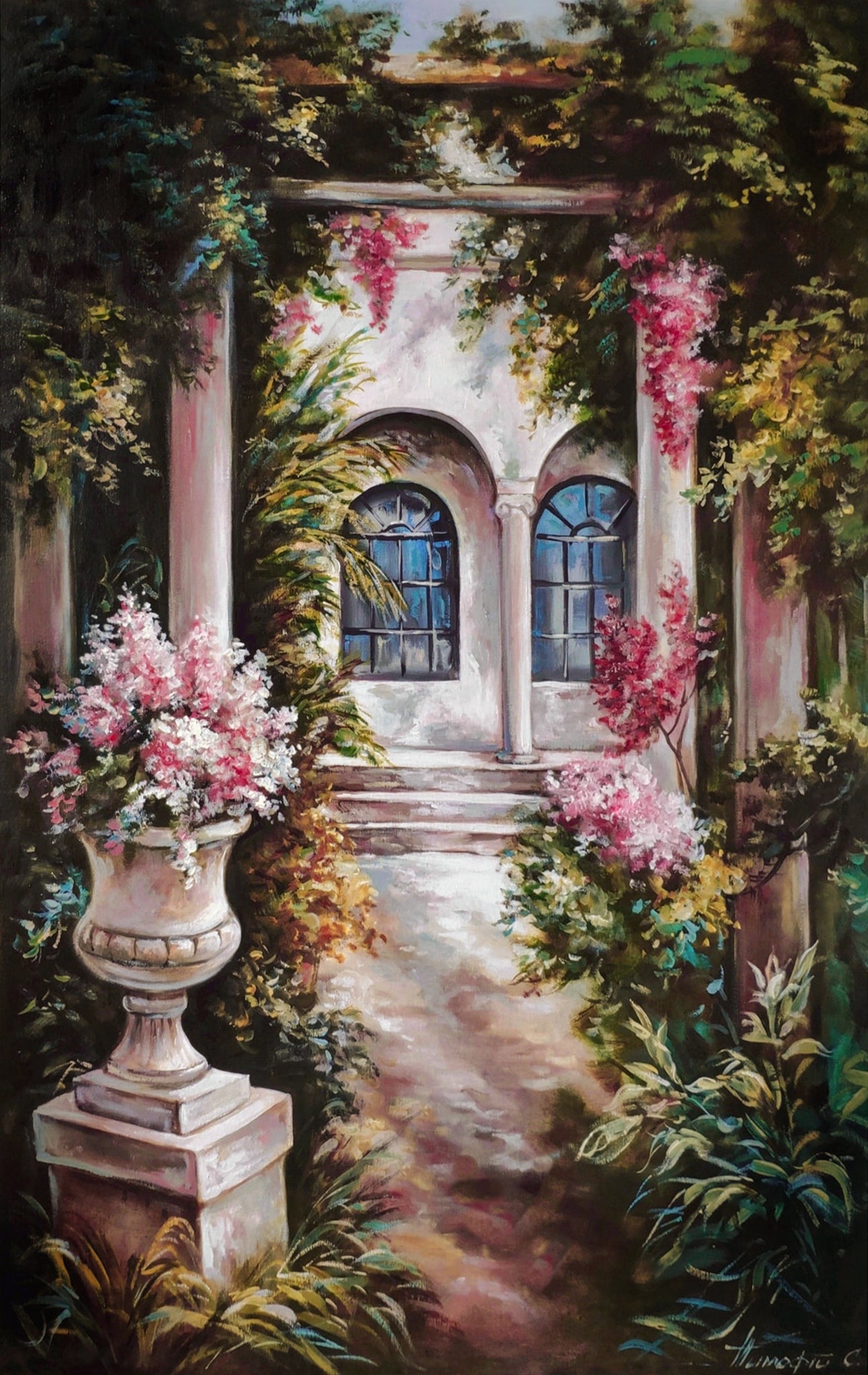 Italian Garden Painting on Canvas Italian Villa Oil Painting Original Flower Garden Wall Art Tuscany Painting Framed