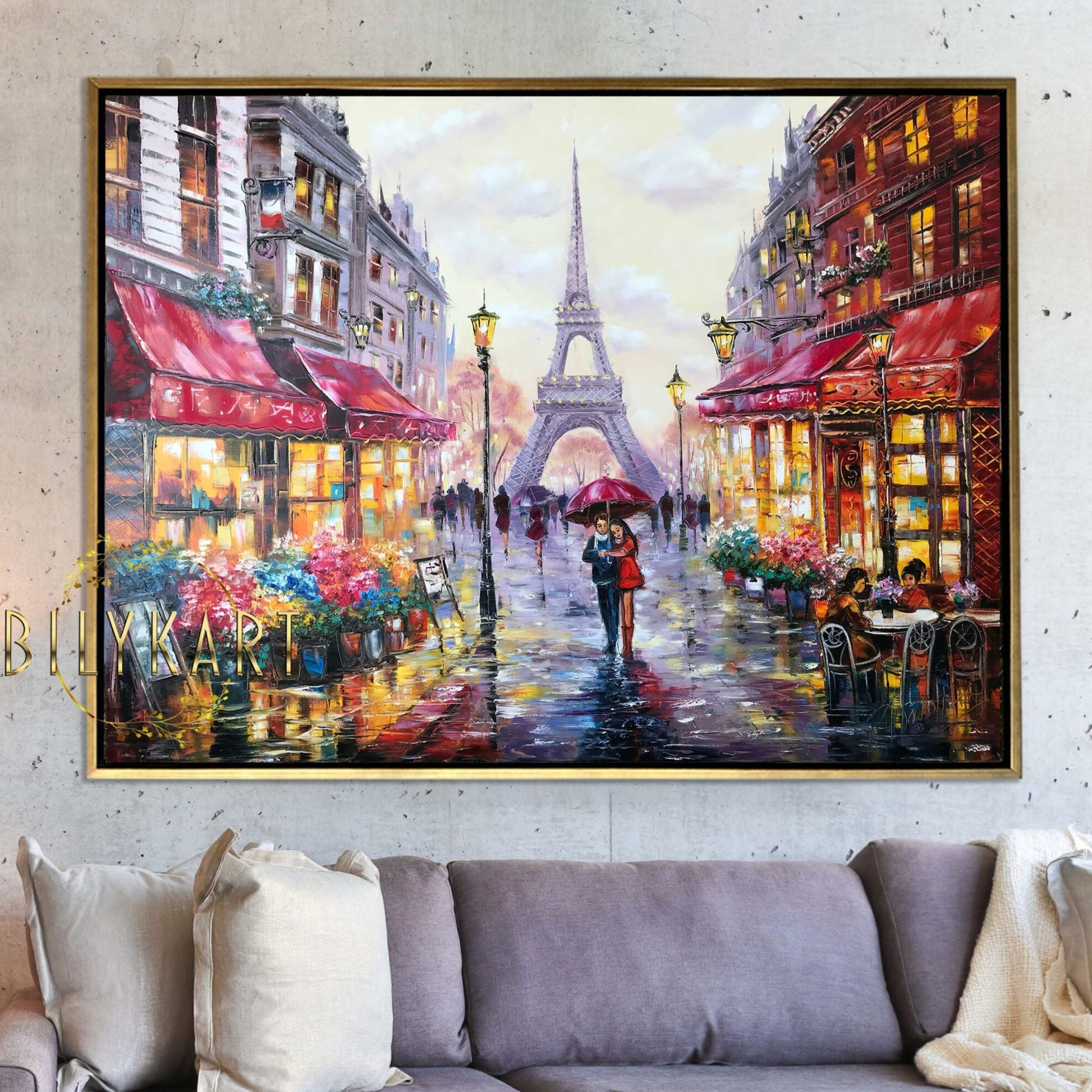 Love in Paris Oil Painting Original Red Umbrella Painting Eiffel Tower Art Evening Walk in Paris Couple in Love Art Night Time Wall Art