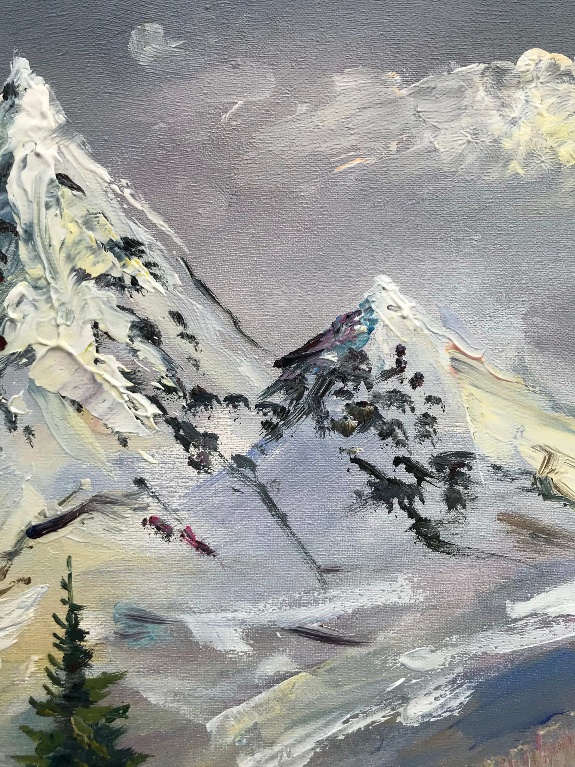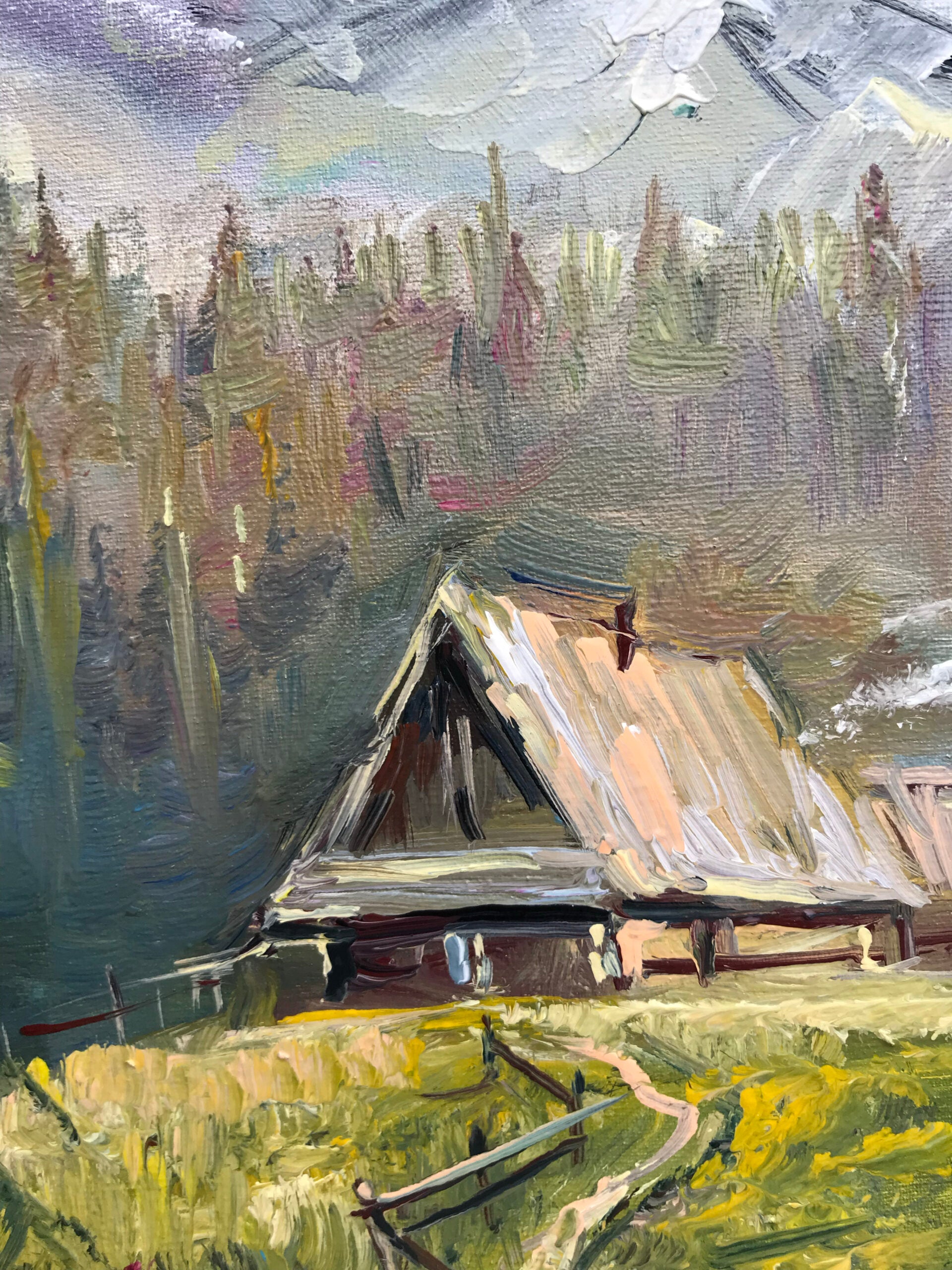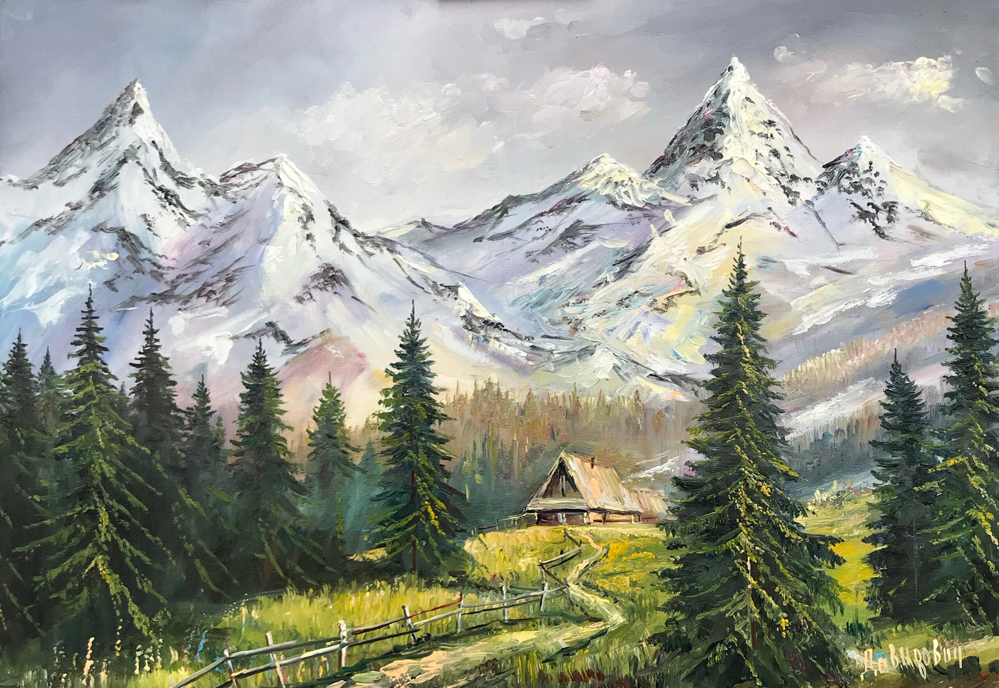 Snowy Mountain Landscape Painting on Canvas Large Nature Painting Pine Trees Wall Art House in Forest Oil Painting Original Smoky Mountain Art
