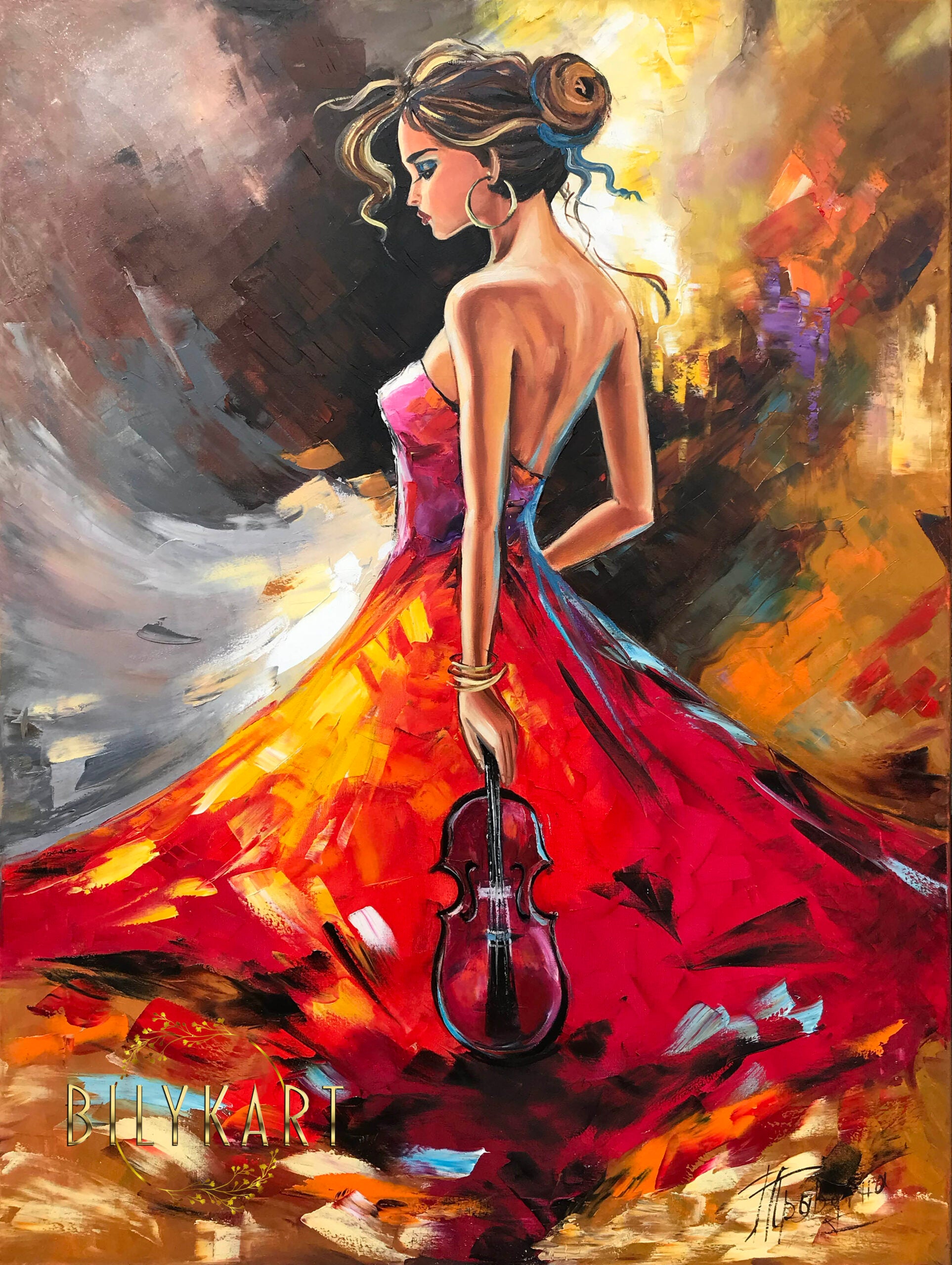 Violinist painting, Music player wall art, Original girl with violin oil painting, Musician gift for him, Woman Back Painting